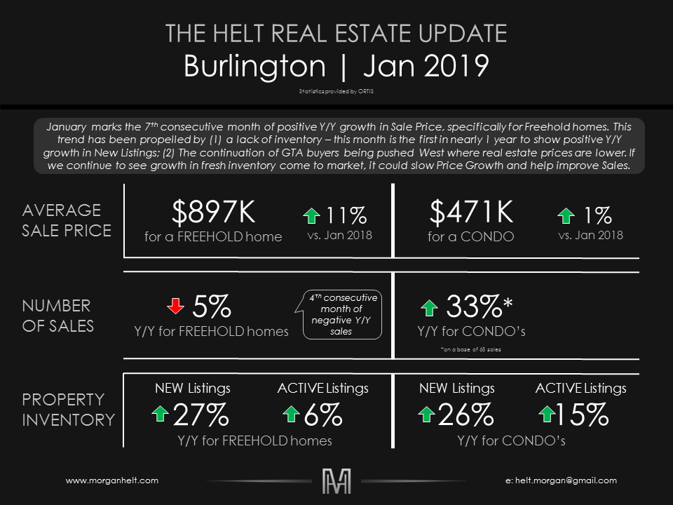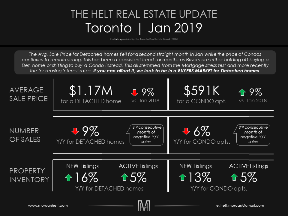 For the last few years, I have been reading the commentary and overviews that the various Real Estate Brokerages and Agents publish when the Monthly Real Estate Figures are released. Each time, I was less than impressed with the lack of transparency around the actual trends and missed opportunity to tie the data points together into a holistic view. Far too often, Agents and Brokerages just report the headlines and then parade this around all month, misleading their audience. So, to kick off 2019, I have decided to start publishing my own overview of the key stats for the various areas that I cover (Toronto, Oakville, Burlington, Hamilton etc.) with a brief but useful (in my opinion) overview of what is happening. I hope you guys will check back each month and please reach-out to me by phone or email if you ever have a question or want to dive deeper into a specific market. So here it is, the inaugural first edition of the Helt Real Estate Update.